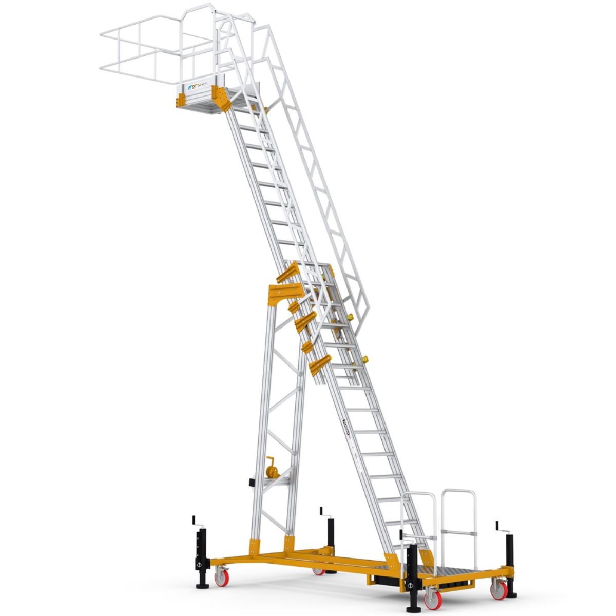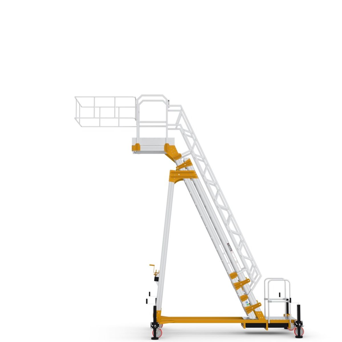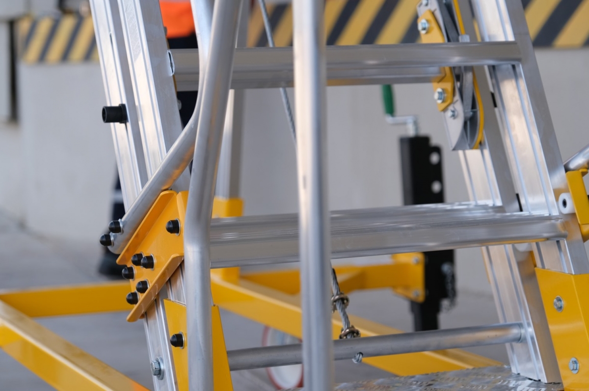 På trods af størrelsen er platformstrappen nem at flytte takket være drejelige, låsbare hjul. Specialstabilisatorer og et hængselsbaseret låsesystem giver ekstra sikkerhed under arbejdet.