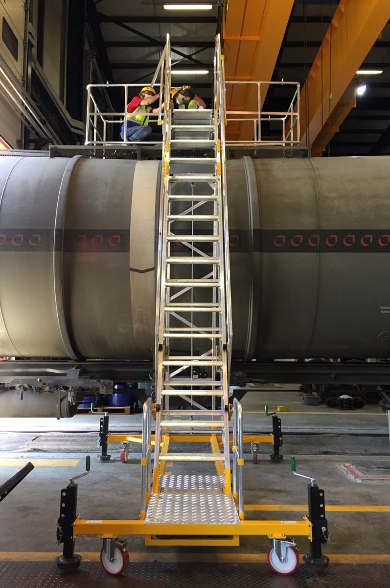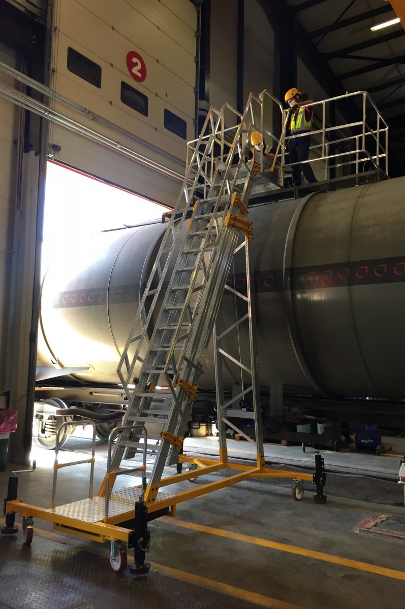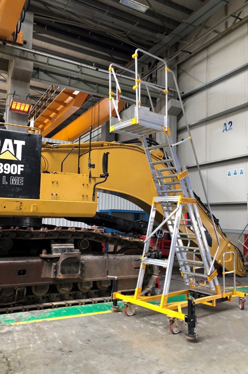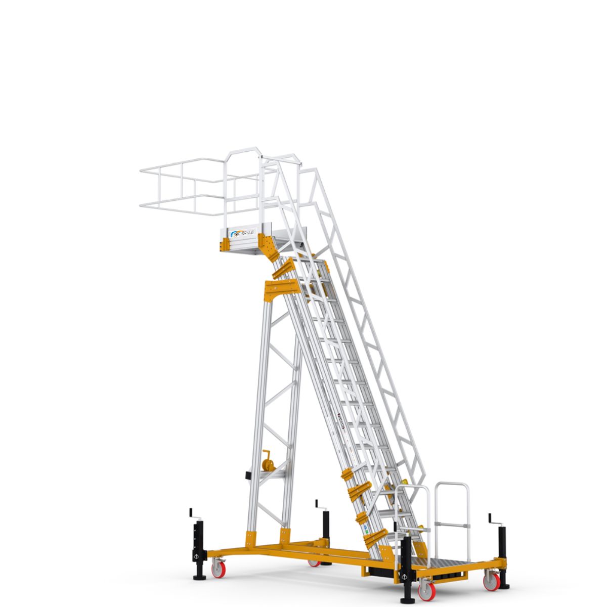 På trods af størrelsen er platformstrappen nem at flytte takket være drejelige, låsbare hjul. Specialstabilisatorer og et hængselsbaseret låsesystem giver ekstra sikkerhed under arbejdet.