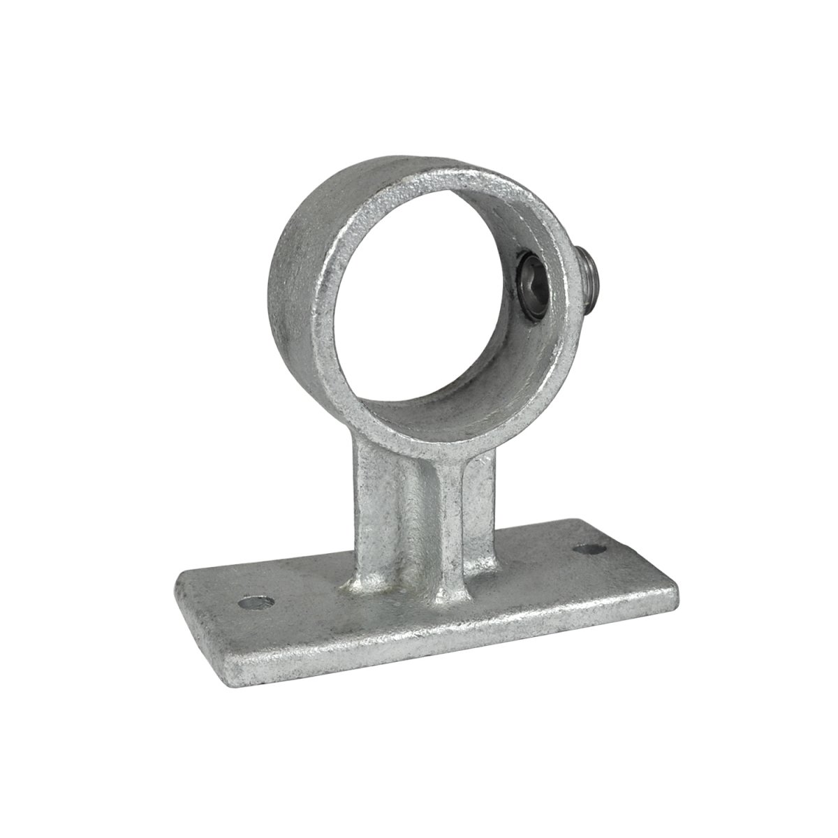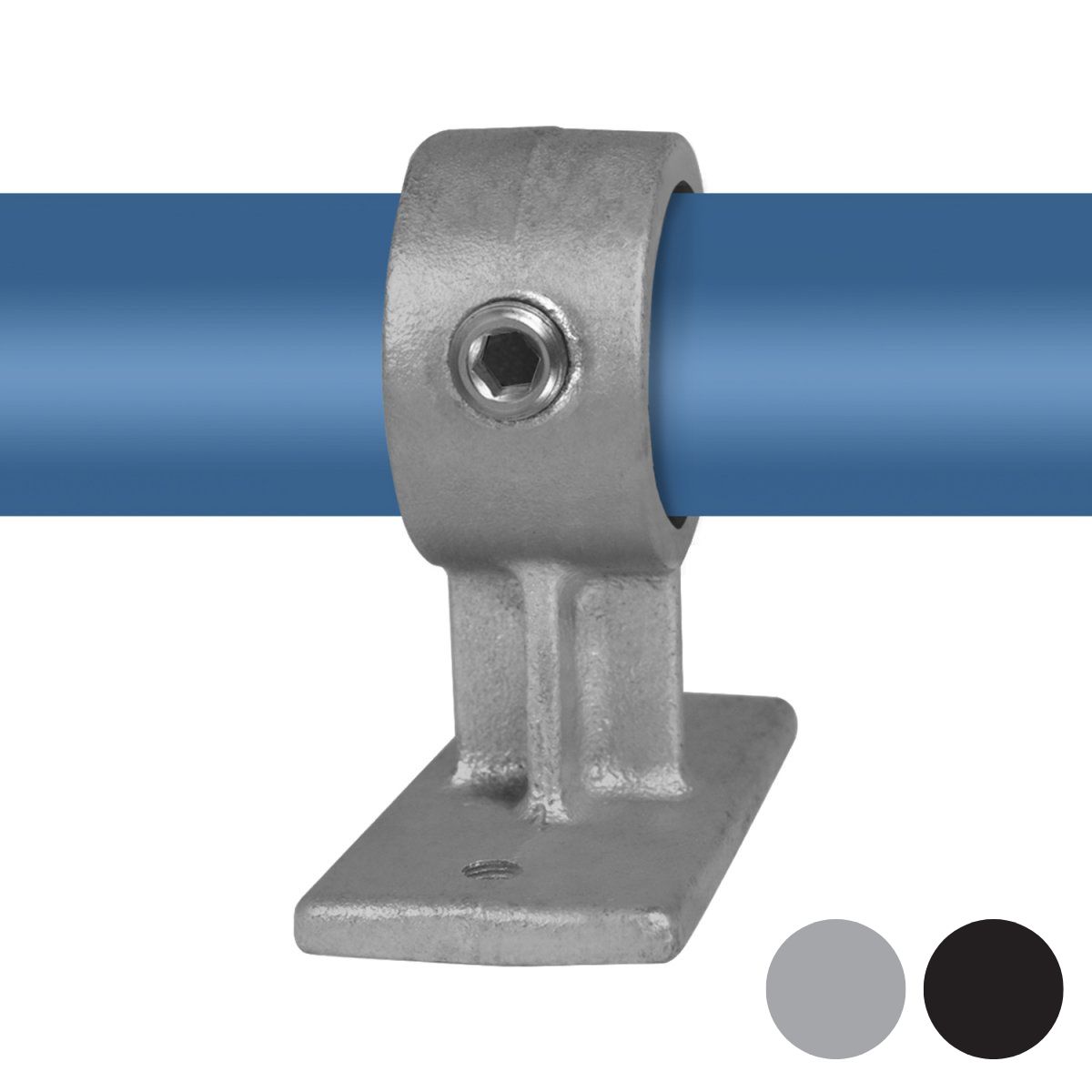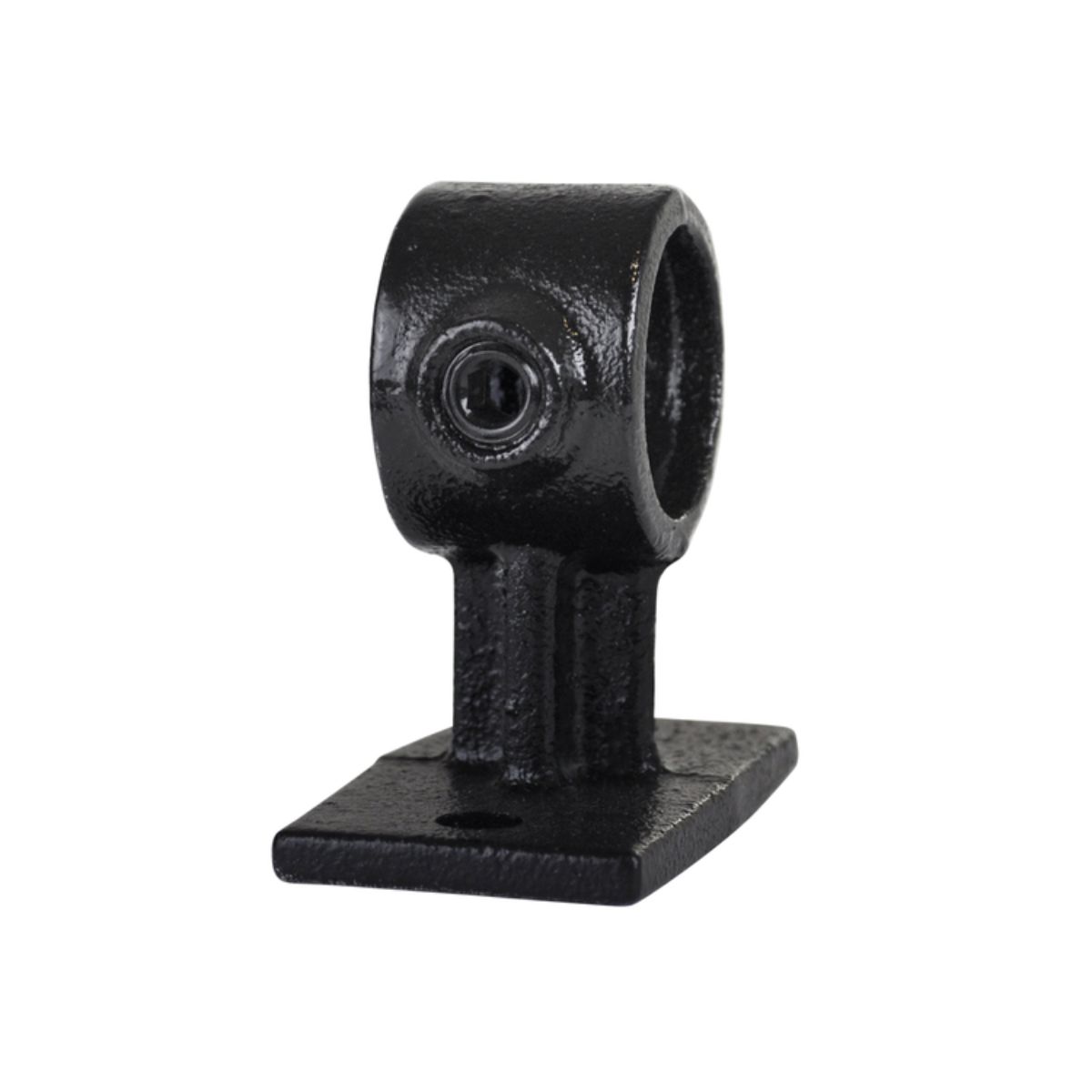 Konsollen monteres i underlaget via bundpladen. Røret placeres i den runde holder og låses med unbrakoskrue, hvilket giver en stabil og vibrationssikker fastgørelse uden behov for svejsning.
