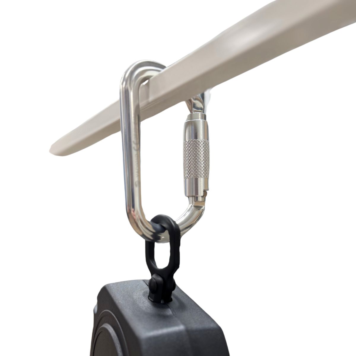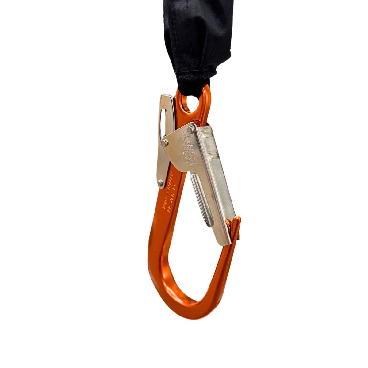 • Denne faldblok er udstyret med en stor aluminiumskarabinhage i bunden, med 60 mm åbning og dobbeltlåst lukning, som nemt kan betjenes med én hånd. I toppen sidder der en twist-lock karabinhage, også i aluminium.