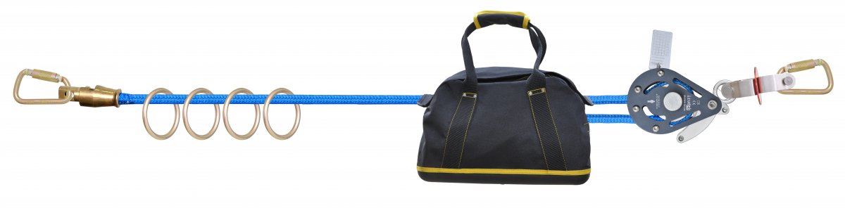 Denna temporära livlina är gjord av semistatiskt rep och är konstruerad för att kunna hantera upp till 4 personer samtidigt. Vår livlina är utrustad med en spänningsindikator som gör det möjligt för dig att exakt spänna linan för högsta säkerhet.