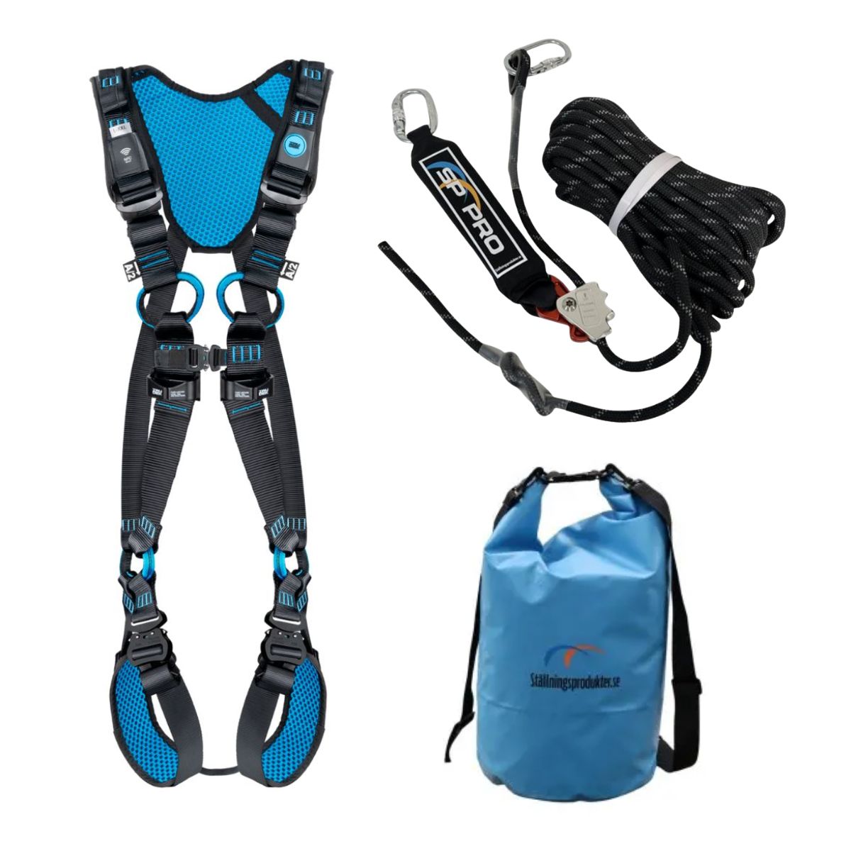 Den medfølgende Wind 1 Pro-sele er en opdatering af den tidligere model Wind Blue 1, med fokus på lavere vægt og enklere brug. Takket være den lette konstruktion og det enkle design er den et fremragende valg til arbejde på tag eller andre højder, hvor bevægelighed og komfort er vigtige. Selen har justerbare stropper med hurtigspænder til bryst og ben samt D-ringe på både bryst og ryg for fleksibel fastgørelse. Den er certificeret efter EN361 og er populær blandt både professionelle og udlejningsfirmaer for sin brugervenlighed.