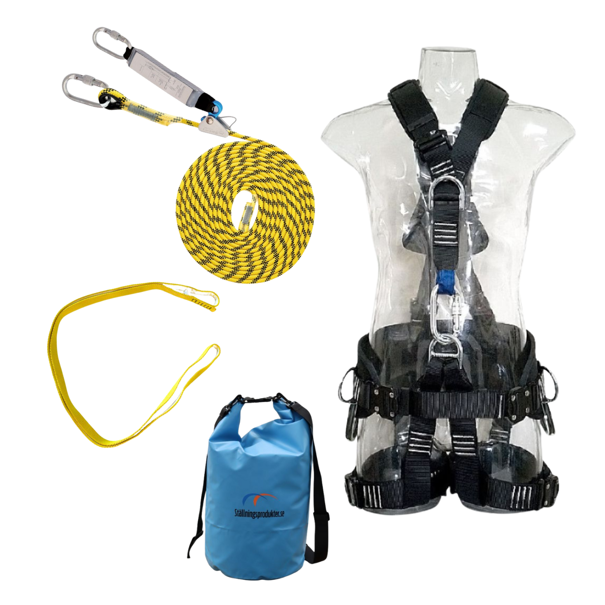 Sikkerhedssele med sikkerhedsline i 10, 20 eller 30 m længde Black er et komplet faldsikringssæt til sikkert arbejde i højden. Du får vores ergonomiske Black Seler Standard, 10 m, 20 m eller 30 m falddæmpende line, 120 cm forankringsslynge og en vandtæt opbevaringstaske - alt sammen til en uovertruffen pris, da selen udgår af sortimentet.