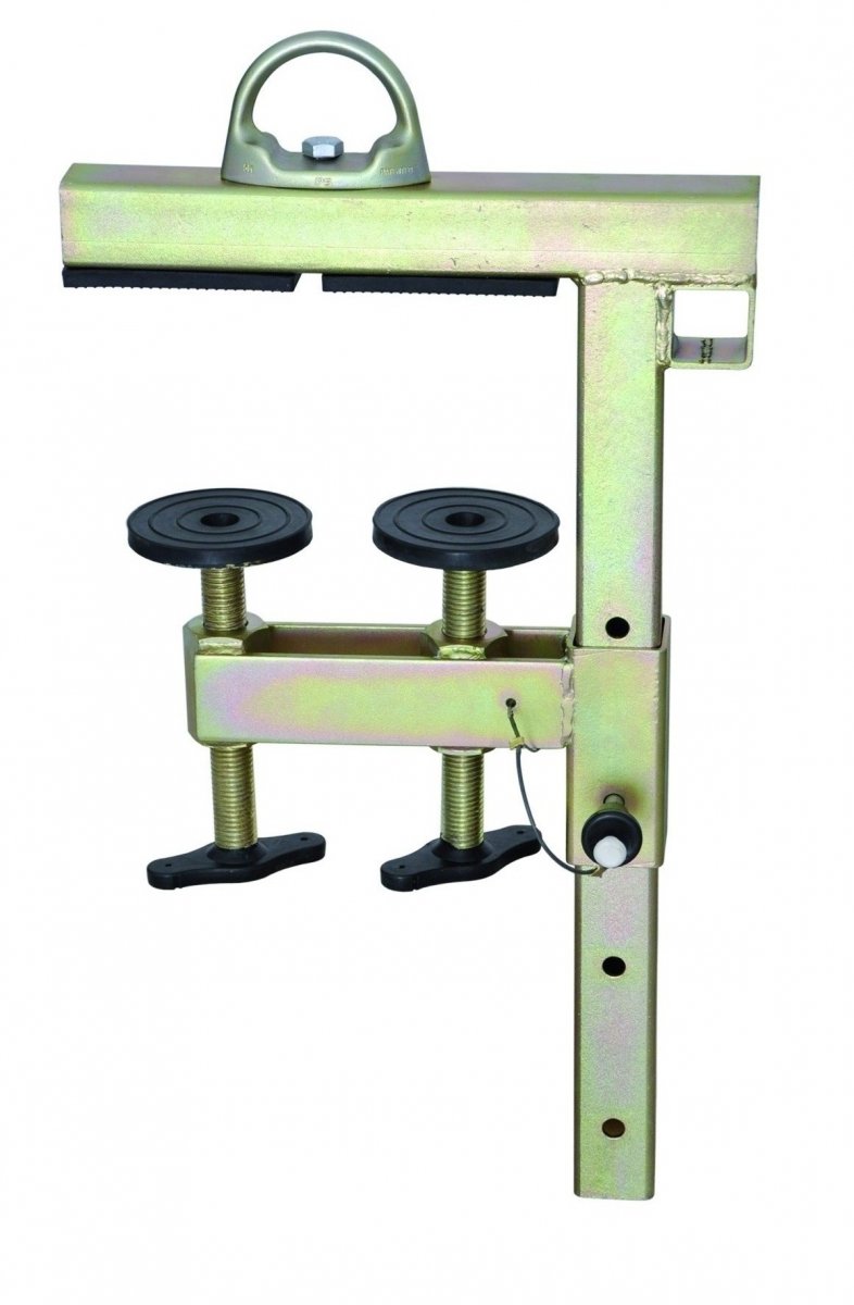 En forankringspunkt af galvaniseret stål med rustbeskyttelse. Designet til brug på bjælker, så punktet er placeret i den øvre og ydre del af en bygnings facade.