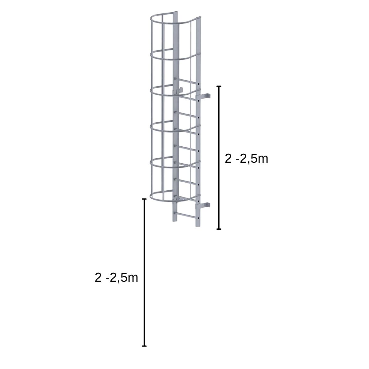 Da klatringen begynder højt oppe, er stigen udstyret med bur og faldsikring fra første trin. Det giver fuldt beskyttelsesniveau gennem hele den vertikale klatring. Systemet er godkendt i henhold til EN ISO 14122-4, så længe insteget er placeret maksimalt 3 m over terræn.
