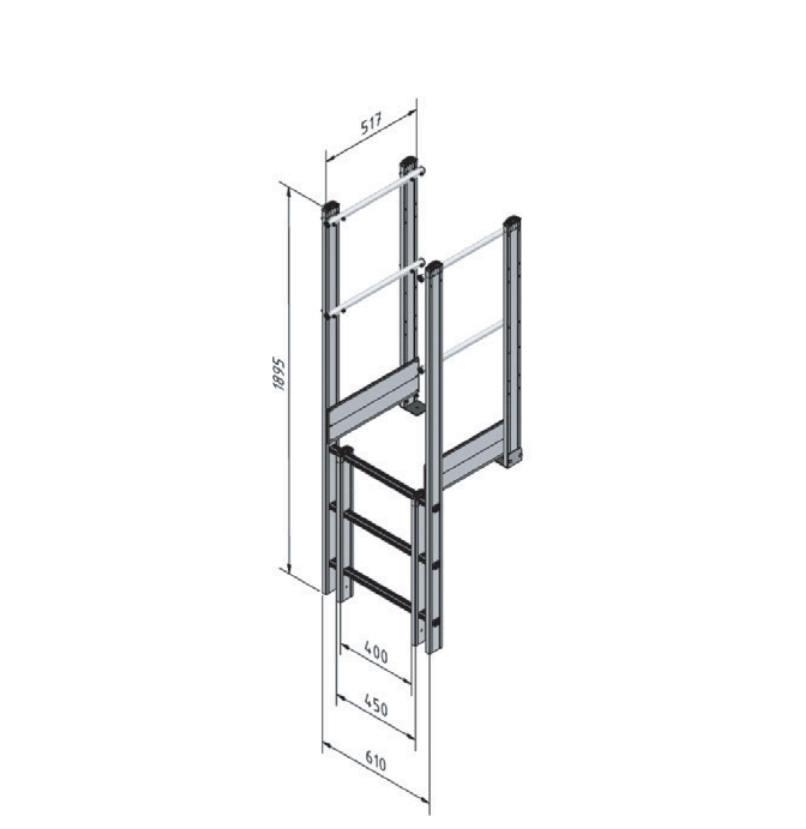 Denne facadestige afslutning med sidegelændere er udviklet til at skabe en stabil og tryg overgang mellem facadestigen og den overliggende arbejdsflade – eksempelvis tag, repos eller serviceplatform.