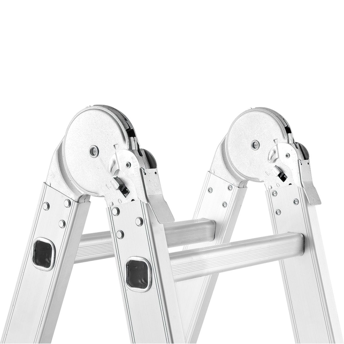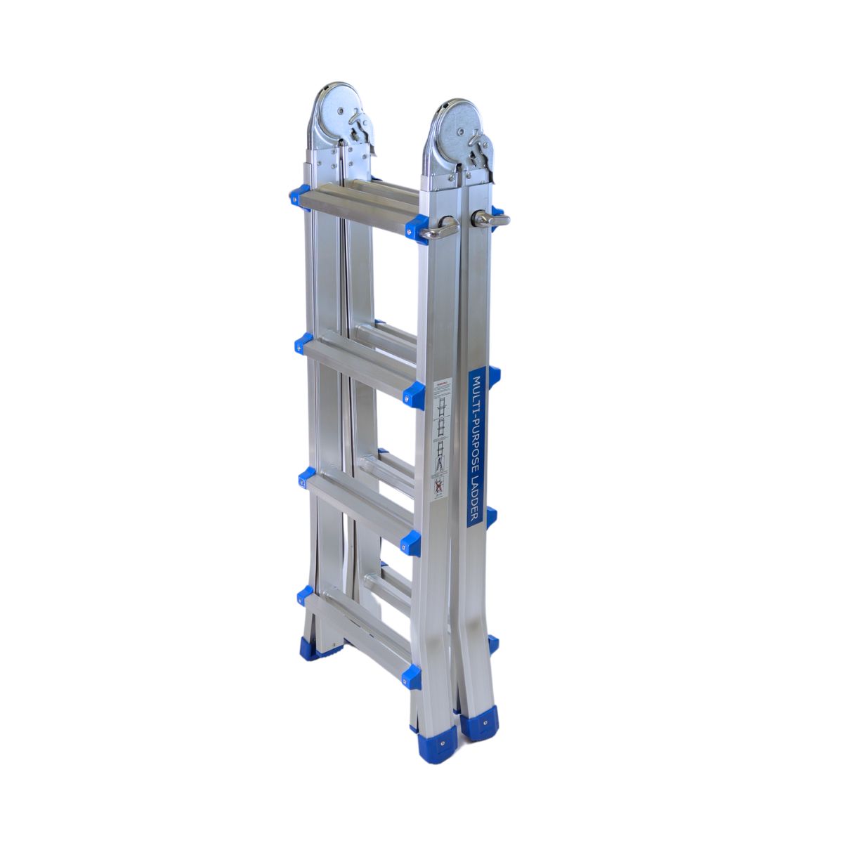 Stigen har 4+4 trin på hver side (7+7 trin fuldt udfoldet). Den samlede længde som enkeltstiger er 4 m, og afstanden fra jorden til det øverste trappetrin er 3,8 m. Der er 30 cm mellem hvert trappetrin. I den mindste A-position er det højeste trin 100 cm, og i den højeste A-position er det højeste trin 180 cm. Takket være den lave vægt og kompakte størrelse er den meget nem at transportere og håndtere. Læs mere under fanen med teknisk information.