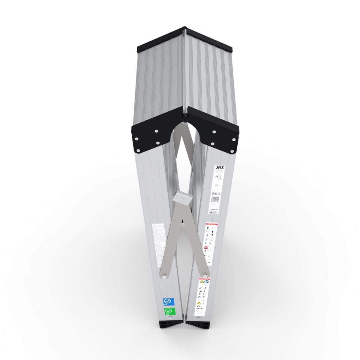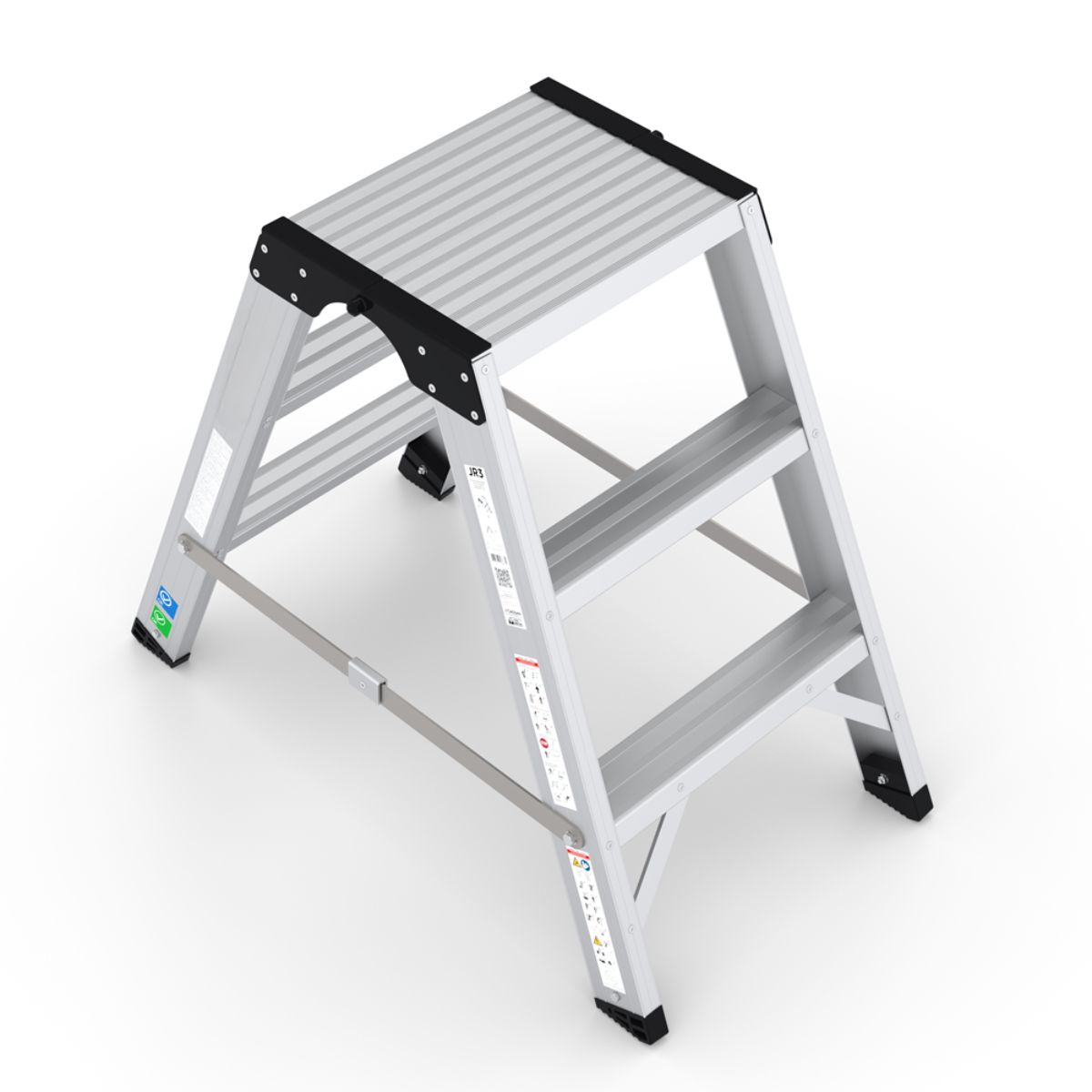 Den dobbelte opstigning gør det muligt at bestige bukken fra begge sider, hvilket er praktisk ved opgaver hvor arbejdsretningen ofte ændres. Trinene giver et sikkert fodfæste og de skridsikre fødder holder bukken stabilt på forskellige gulvtyper. Det sikrer en tryg arbejdsoplevelse.