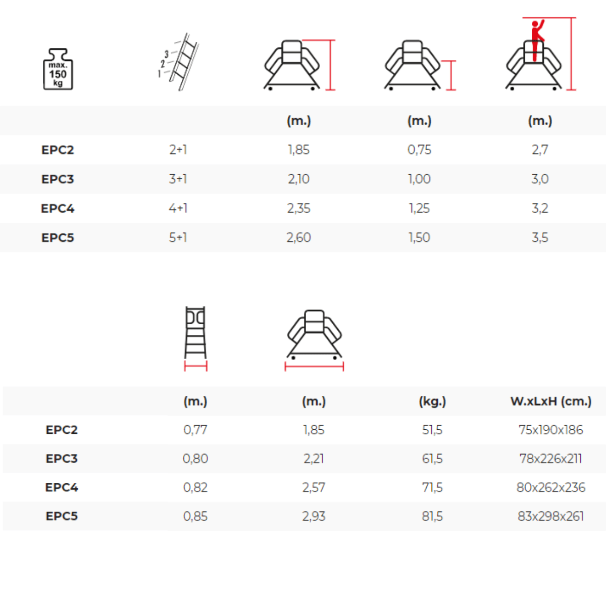 Vores dobbeltsidede platformstrappe fås i fire forskellige størrelser med en platform på 60x75 cm. Vores mindste model har to trin og en platform, mens den største model har fem trin og en platform.