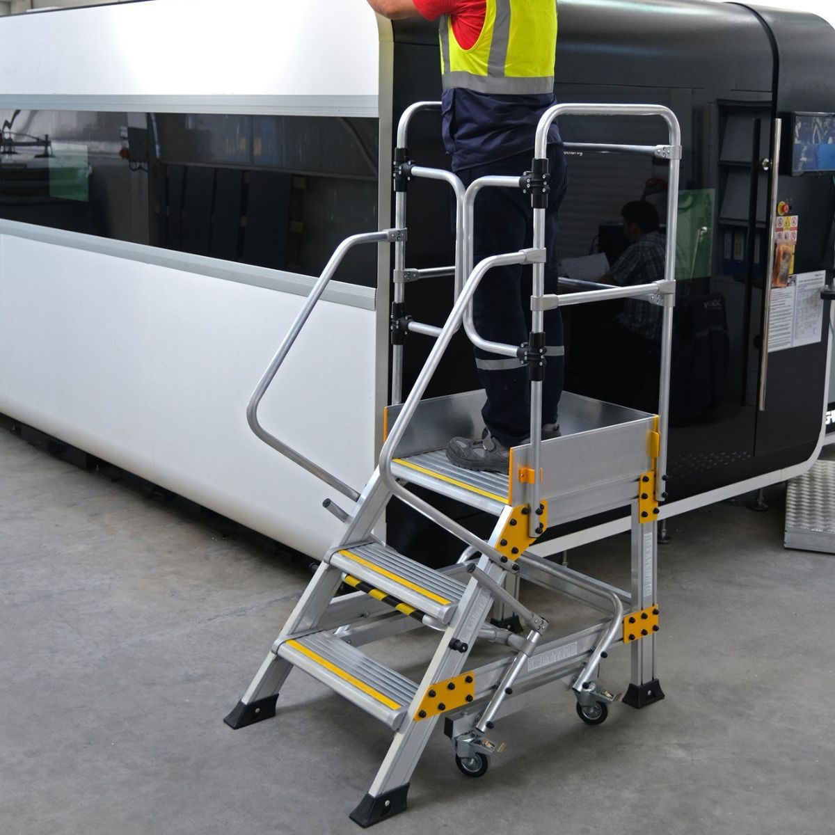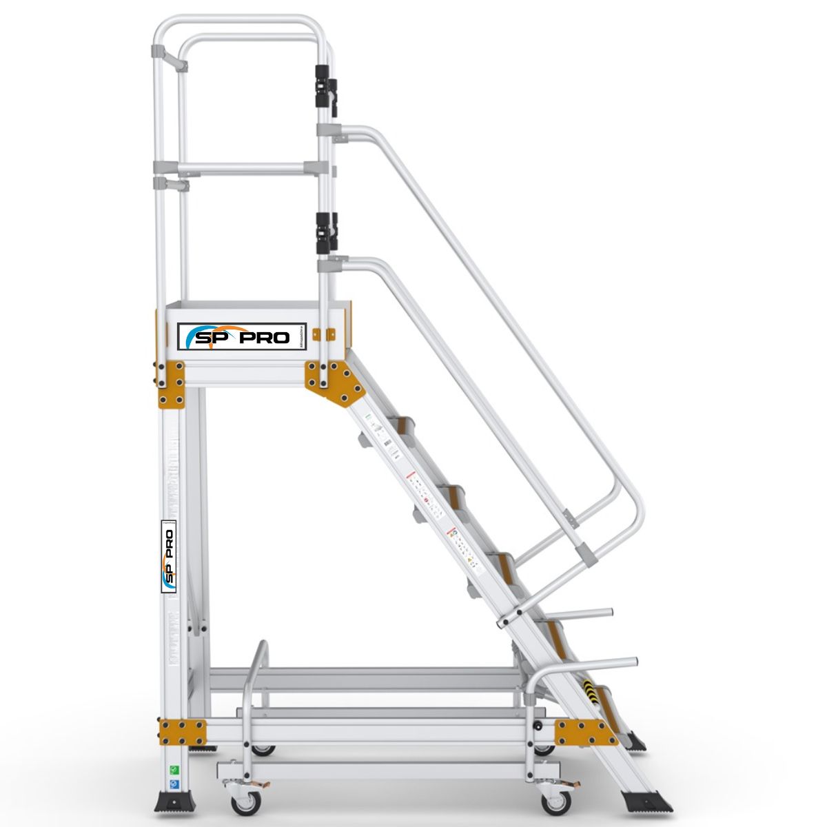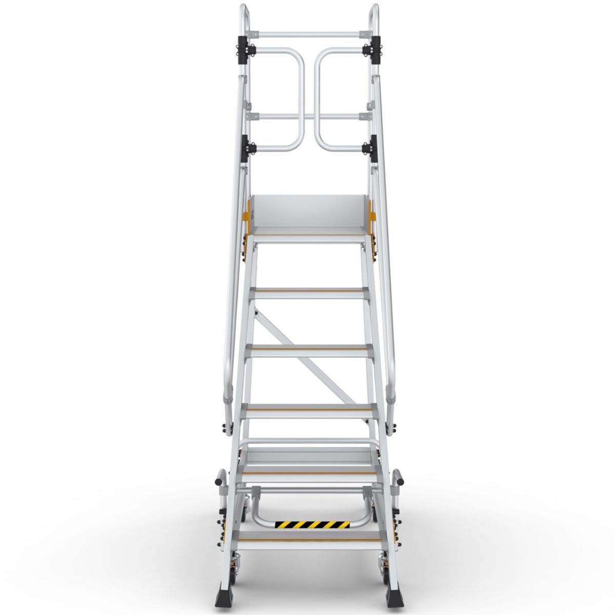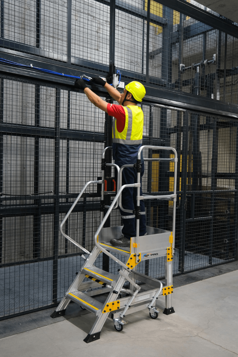 De høje gelændere giver støtte og tryghed, når du arbejder på platformen, og den indadgående fjederdør holder arbejdsområdet beskyttet uden at begrænse din bevægelsesfrihed. Det betyder, at du kan arbejde mere effektivt og holde fuldt fokus på opgaverne.