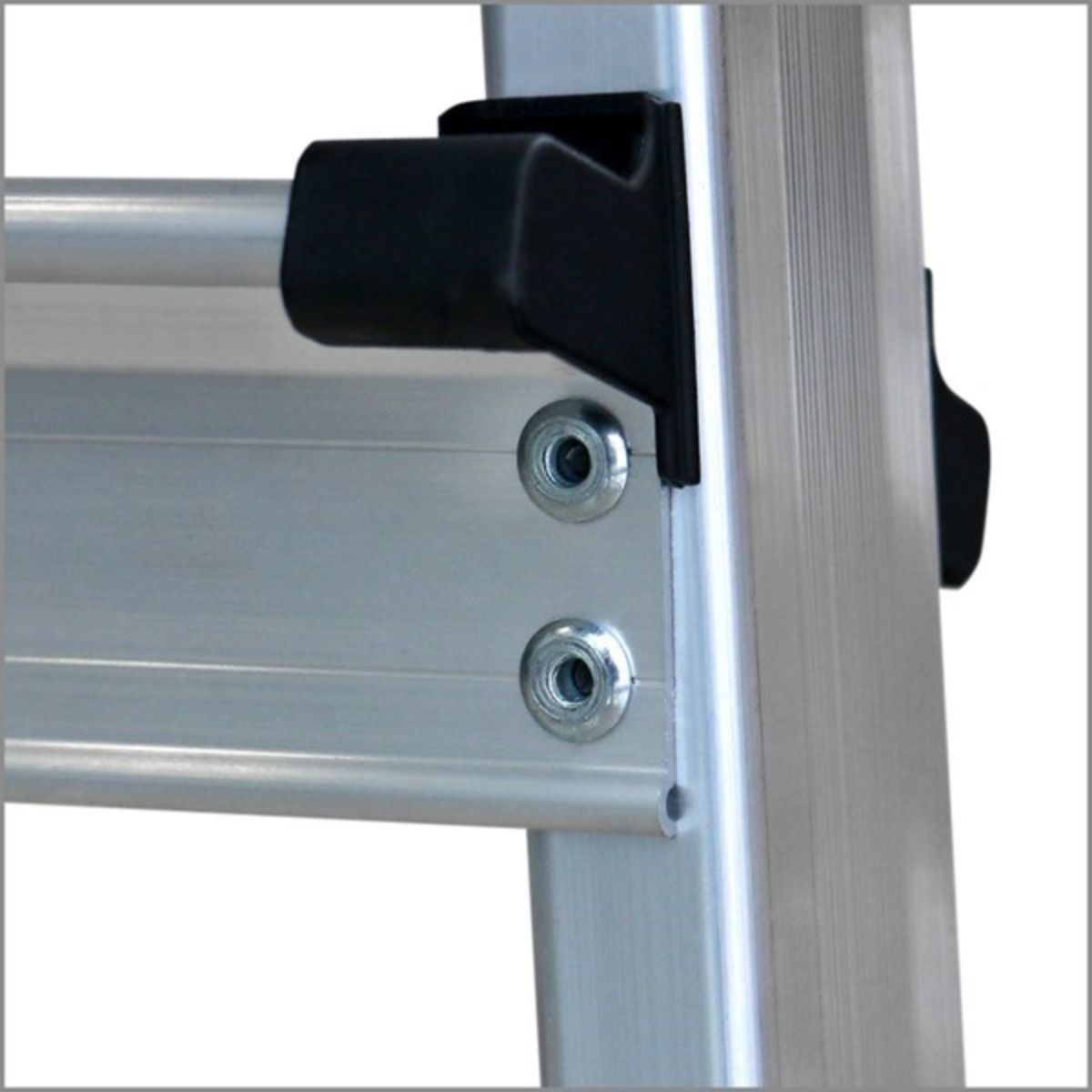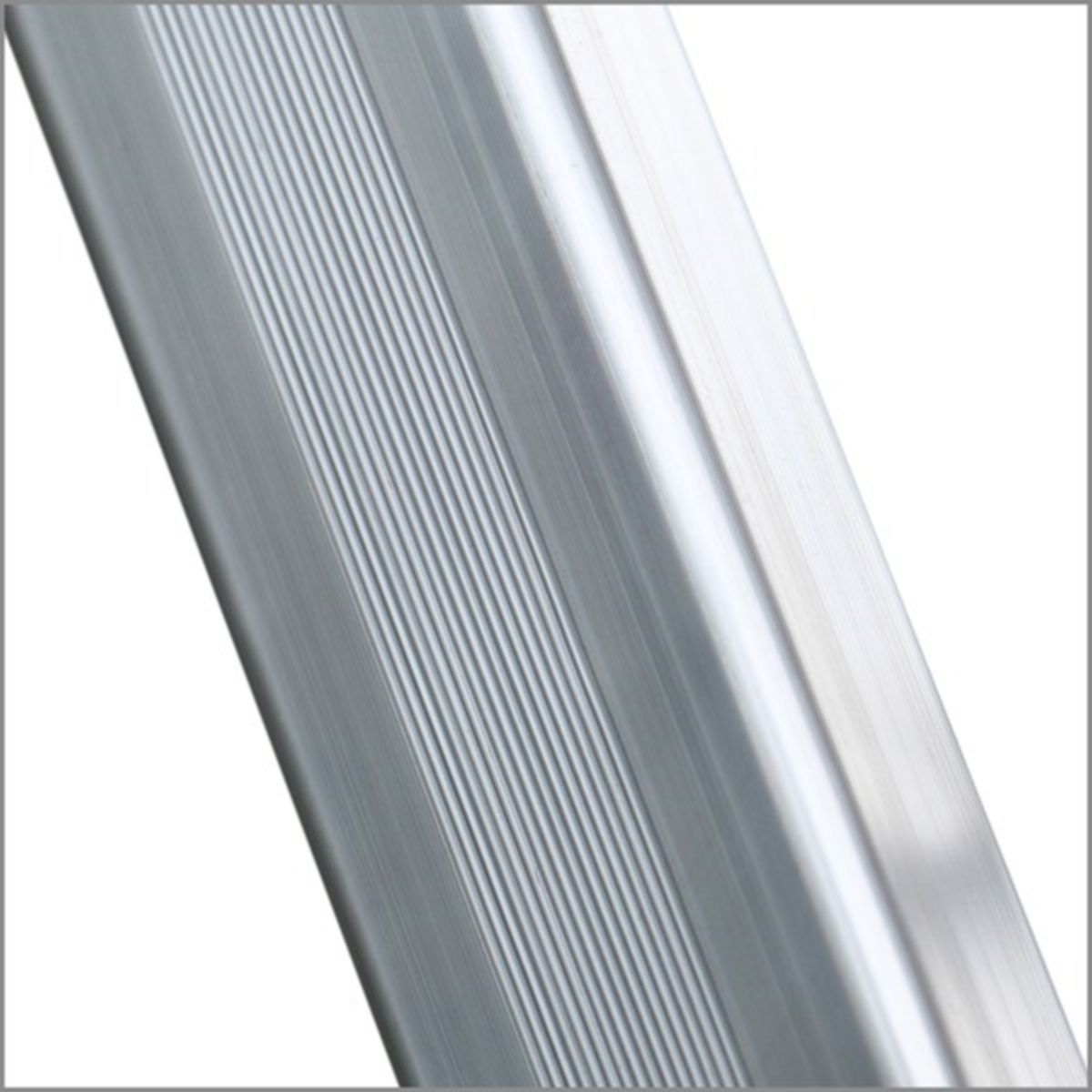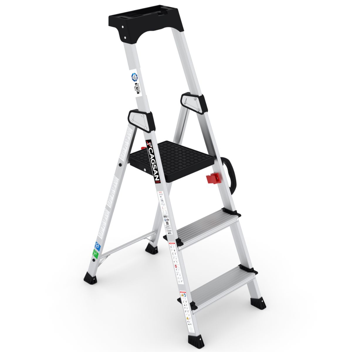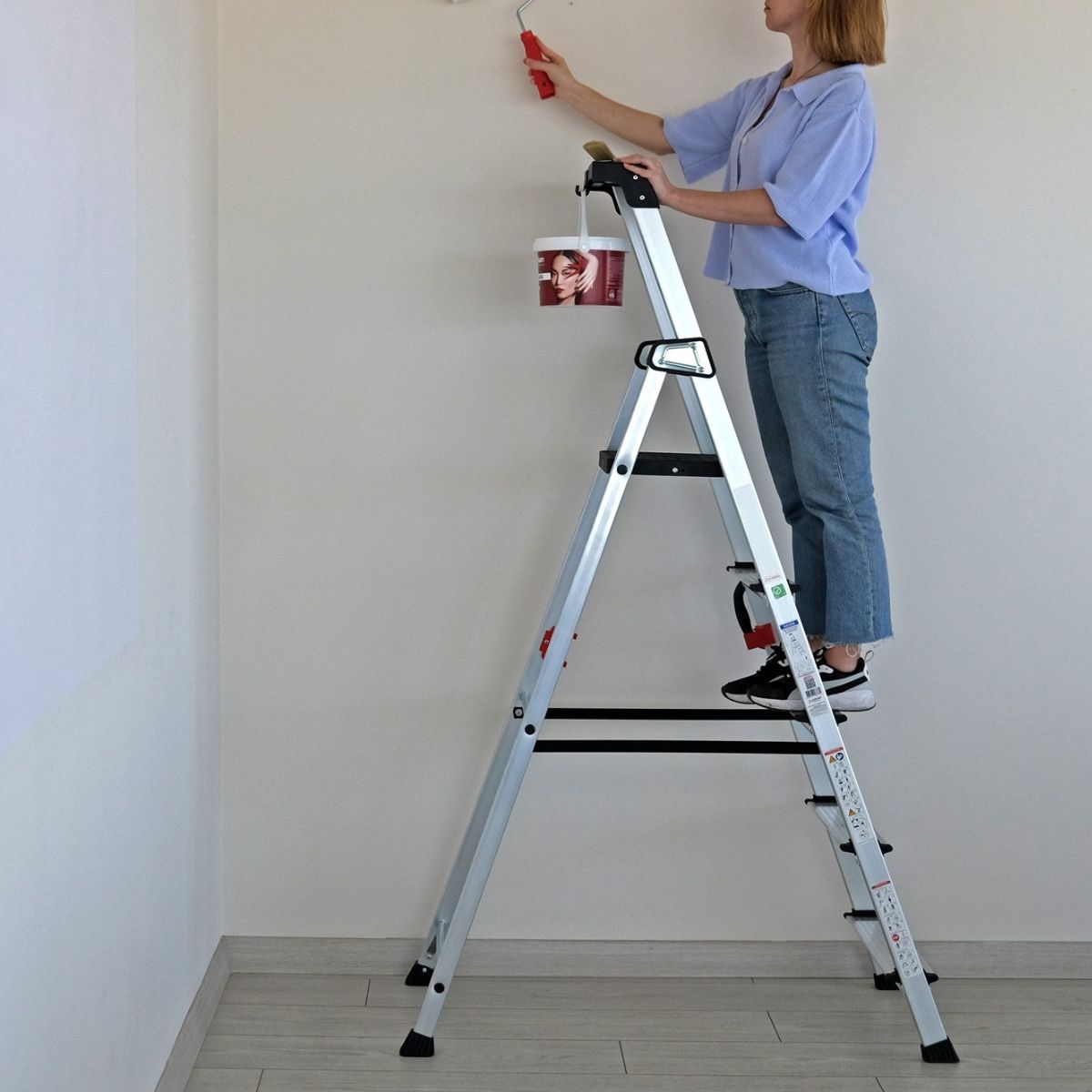 Sammenklappelig trappestige i kraftigt aluminium med en grundhøjde på 67 cm og en anbefalet makshøjde på 2,6 m. Stigen er 2+1, hvilket betyder, at den har to trin og en platform. Den har en holdbar aluminiumsstruktur med en maksimal belastning på 150 kg. Stigens platform har et skridsikkert mønster, og fødderne er udstyret med skridsikre gummifødder for at give ekstra sikkerhed og tryghed under arbejdet.