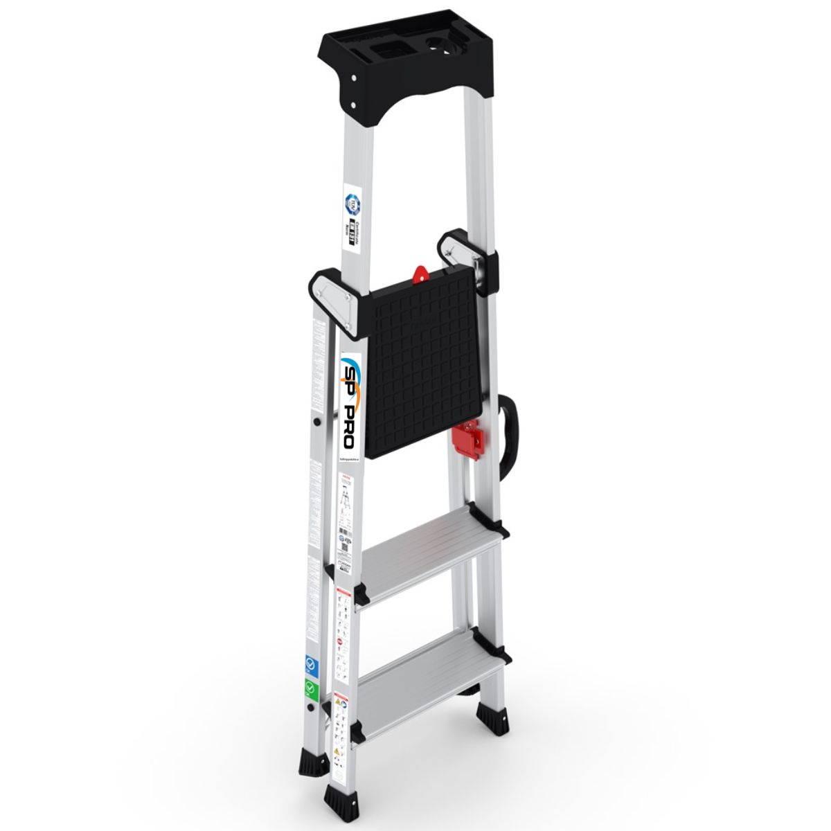 Denne sammenklappelige stige er designet kompakt med et praktisk håndtag, så du nemt kan opbevare og tage den med dig. Stigen er udstyret med en multifunktionel værktøjsbakke, så du altid har dine værktøjer lige ved hånden. Det er en alsidig og praktisk stige til både professionelt arbejde og hjemmebrug.