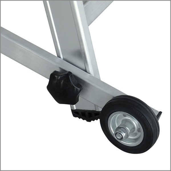 Denne trappestige er udstyret med hjul på bagsiden, så du nemt kan flytte den rundt på arbejdsområdet. Derudover kan du let folde stigen sammen, så den fylder minimalt, når du ikke bruger den.