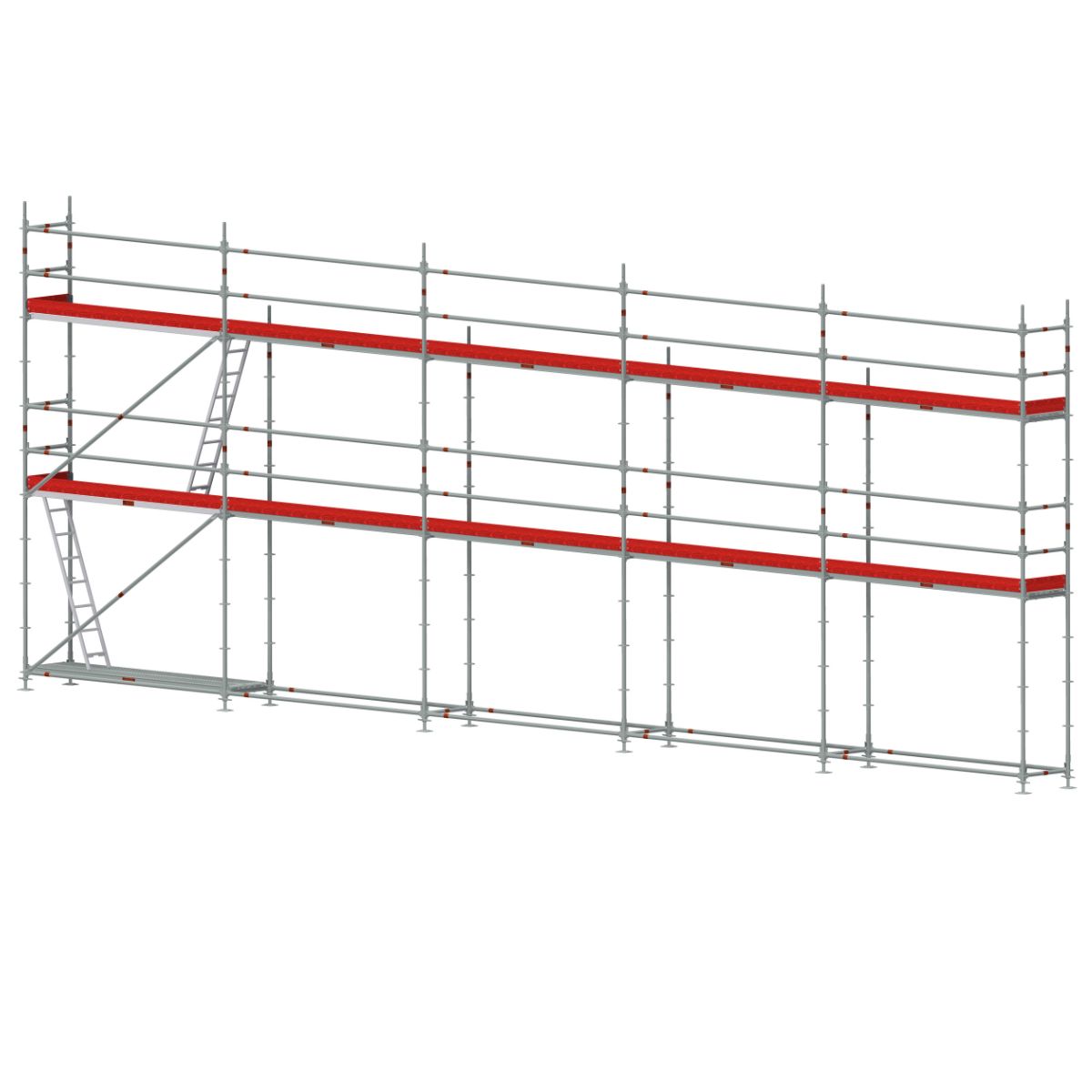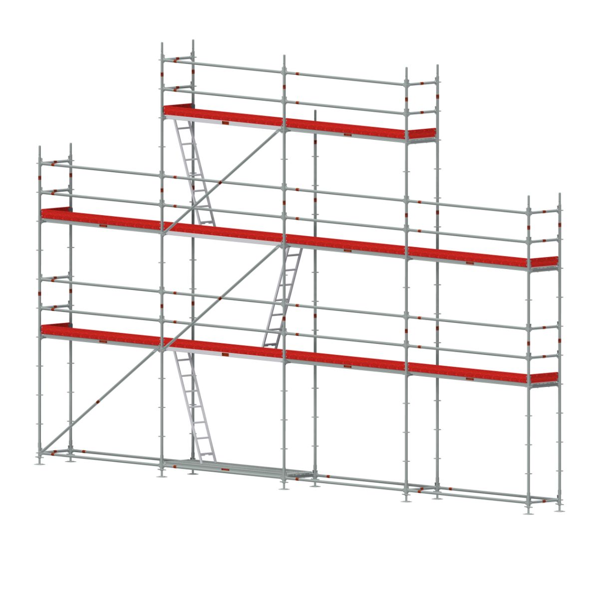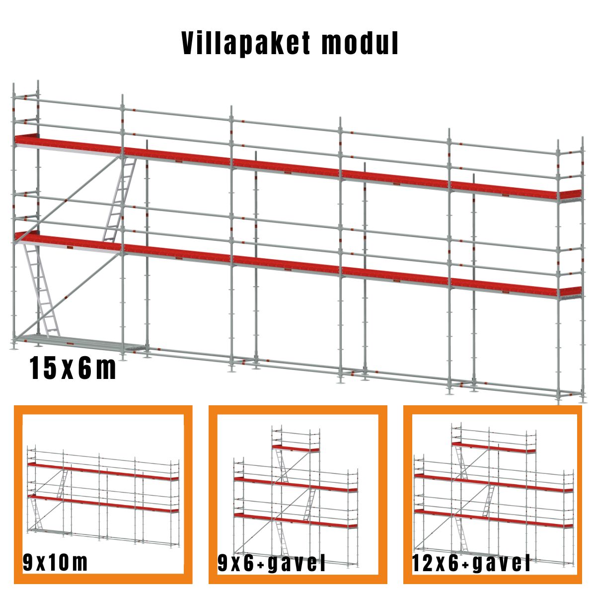 Vores villapakke modulstillads i stål er en komplet stilladspakke, der er sammensat for at opfylde de mest almindelige behov. Denne pakke kan bygges på mange forskellige måder og består af modulstillads i topklasse. Stilladset har en længde på 15,35 m og platformsniveauer på 2-2,5 m, 4-4,5 m og gavltop på 6-6,5 m, alt efter hvordan du justerer bundskruerne. Det giver en maksimal arbejdshøjde på ca. 8-8,5 m.