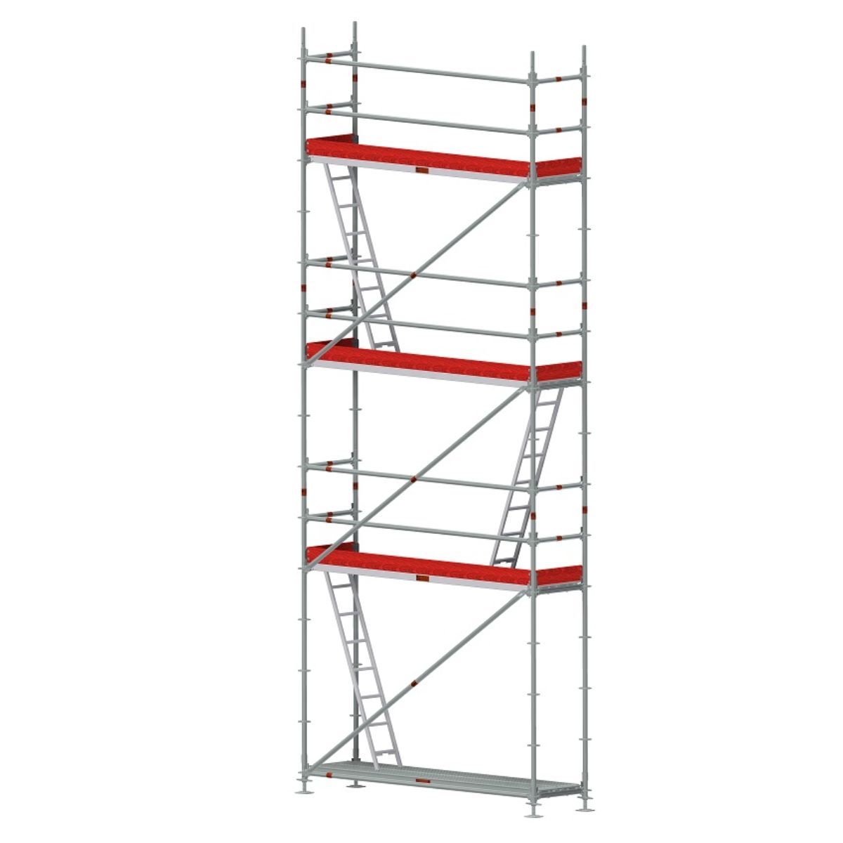 Denne stilladspakke er designet til at være så tilpasningsdygtig som muligt. Med muligheden for at samle den i tre forskellige varianter, kan du nemt tilpasse den til alt fra tagarbejde til facaderenovering. Justerbare bundskruer gør det muligt at finjustere højden, så du får en stabil arbejdsplatforme uanset jordforholdene.