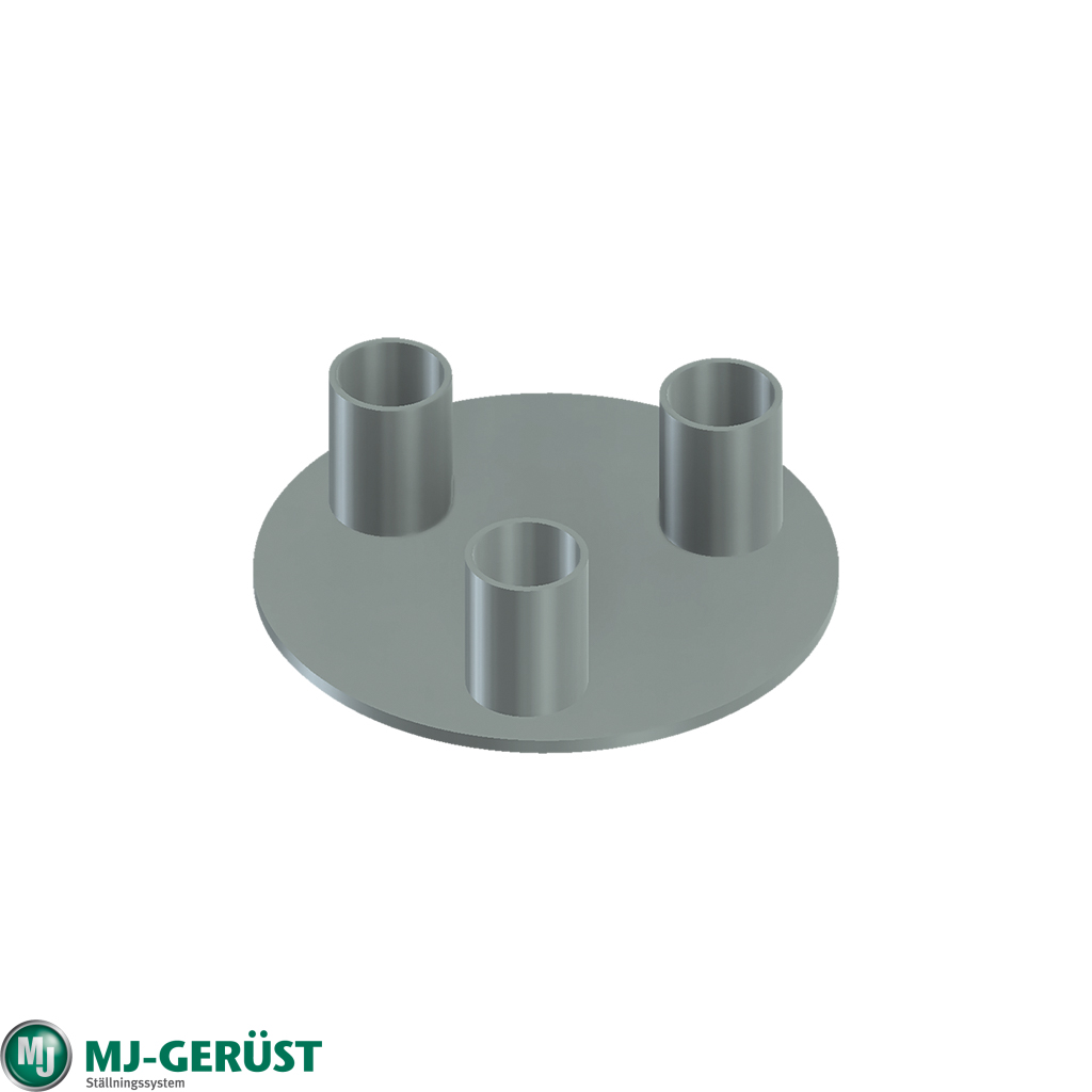 Bundplade til Trekantsøjle er en robust og pålidelig grundkomponent, der er designet til at stabilisere og fordele belastningen fra trekantsøjler ved tunge stilladskonstruktioner. Den er fremstillet i galvaniseret stål og udstyret med tre svejsede rørholdere, hvilket sikrer, at belastningen optages på en sikker og effektiv måde.