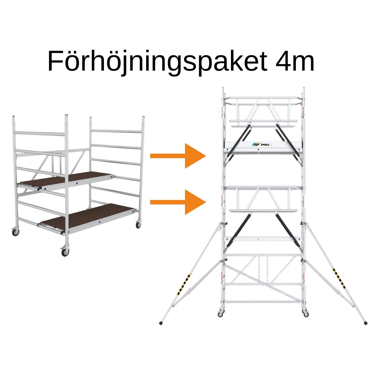 Med vores Forhøjningspakke til Bred Håndværkerstillads ProTube kan du nemt bygge videre på dit eksisterende stillads for at nå højere arbejdsområder. Pakken er udviklet til dig, der allerede har grundpakken med foldbar grundsektion, to platforme og fire hjul. Ved at vælge den rette udbygning hæver du platformhøjden til 2, 3 eller 4 meter alt efter projektets krav.