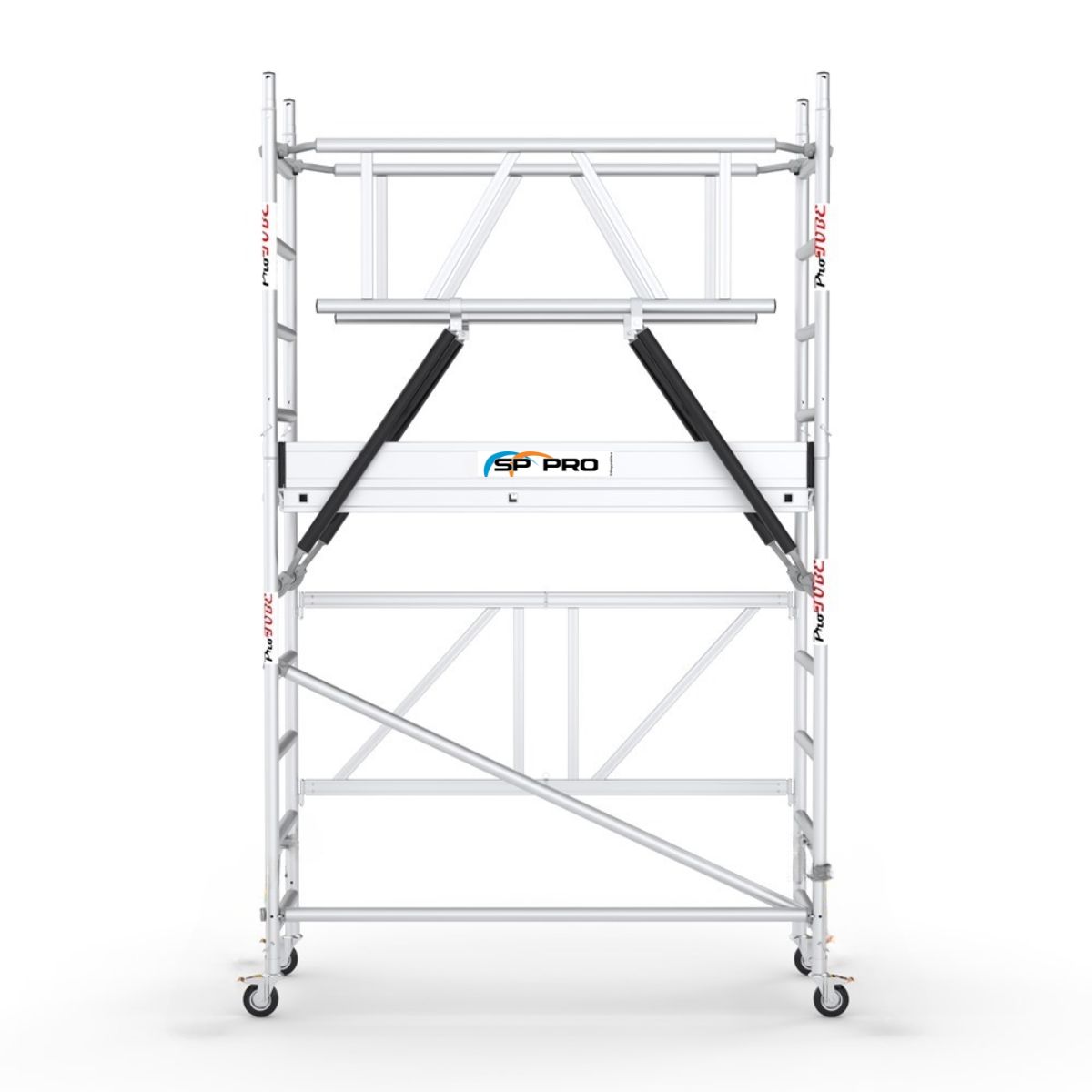 Forhøjningspakken består af robuste aluminiumsrammer og stabiliserende stag, som hurtigt monteres på plads. Takket være den lette konstruktion er det nemt at flytte og tilpasse stilladset efter behov. Den brede platform på 135 x 190 cm giver masser af arbejdsplads til både værktøj og materialer.