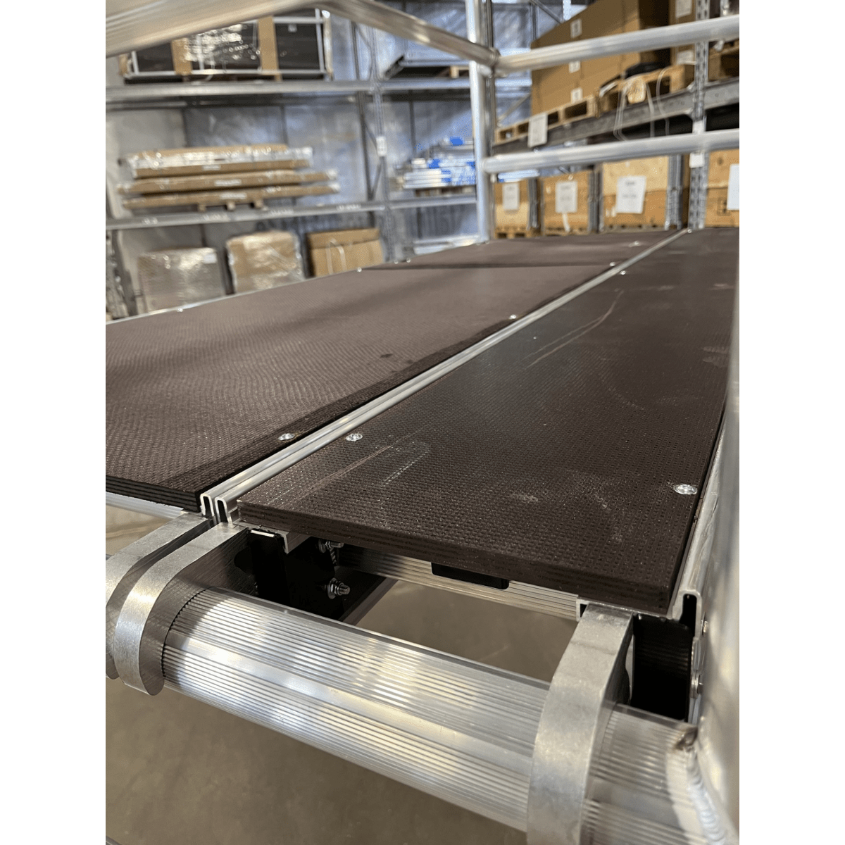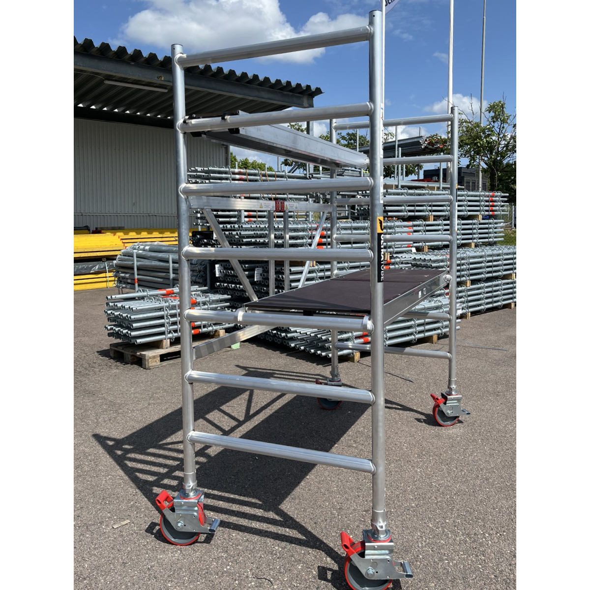 Den sammenklappelige grundsektion gør stilladset hurtigt at opsætte og let at flytte gennem smalle passager uden at skulle demonteres. Aluminiumsrammen holder vægten nede, og de låselige hjul sikrer stabilitet under brug. Denne model er særligt egnet til arbejde i korridorer, boliger, værksteder og andre steder, hvor mobilitet og bred arbejdsplads er vigtigt.
