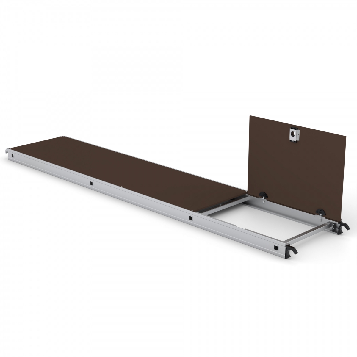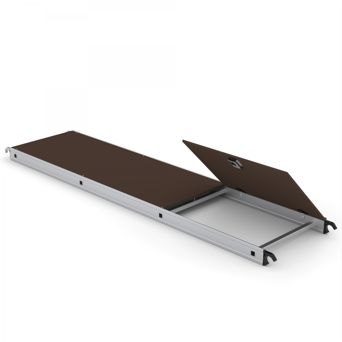 Platformen er tilpasset rullestilladser med 250 cm længde og bruges ofte sammen med smallere platforme for at skabe stabile, funktionelle arbejdsniveauer.