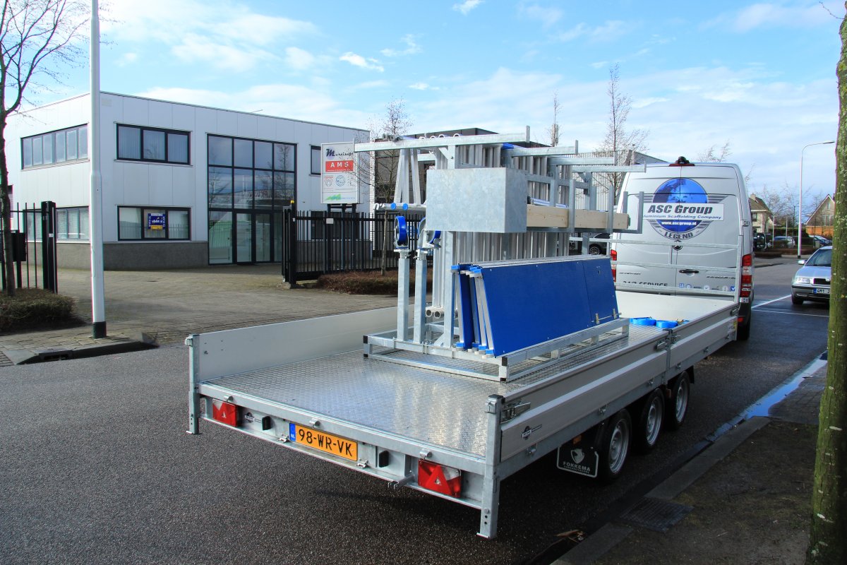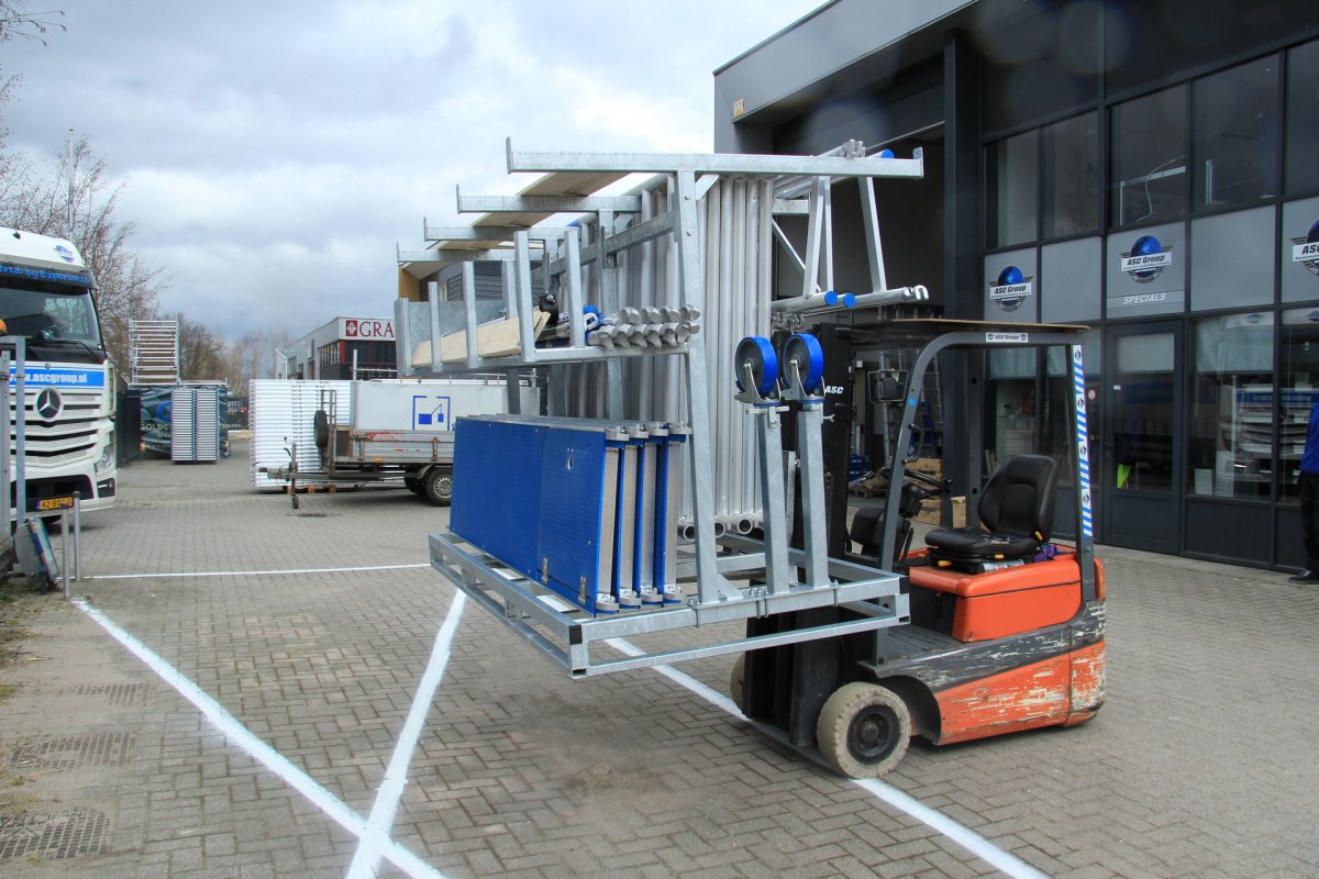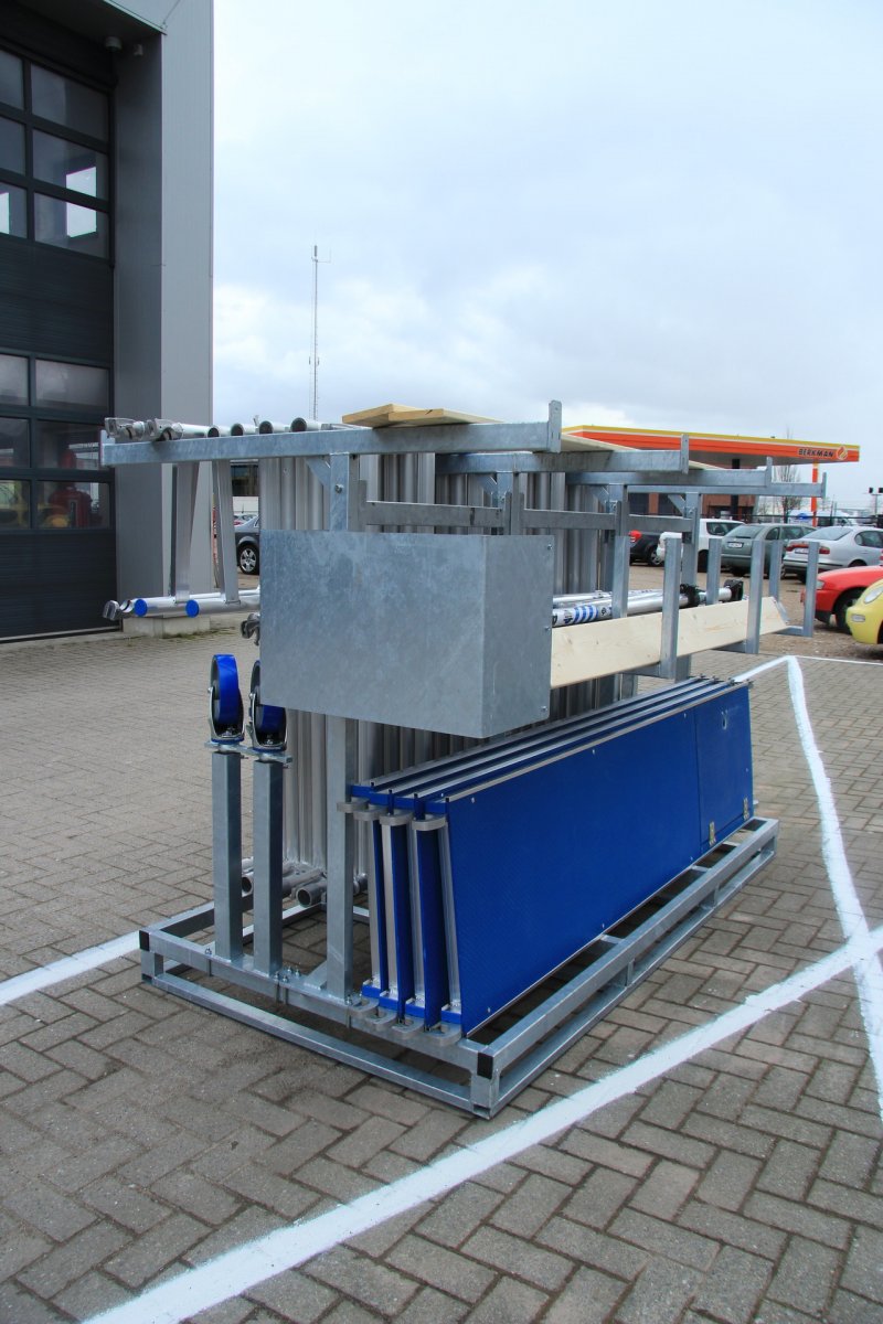 Et stativ til rullestillads, som kan læsses med truck på lad eller trailer. Giver dig et godt overblik over materialet og gør det nemmere at håndtere ved montering og demontering. Racket er lavet af 4 mm galvaniseret stål, hvilket sikrer en lang levetid. Designet gør det muligt at løfte reolen både fra siden og fra gavlen.